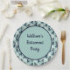 These paper plates are ready to be personalized with your own custom message. They feature a border of of wooden Adirondack chairs in navy blue, eggshell white and charcoal gray against a light aqua blue background with your message in the center in navy blue script lettering against a light aqua blue background.