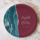 These elegant modern wedding plates feature a teal watercolor design trimmed with faux silver glitter. Easily customize the silver gray text on a burgundy red background, with the names of the bride and groom in handwriting calligraphy over a large ampersand.