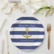 Une fausse ancre d'or (pas de feuille) est au centre de cette plaque de papier rayé bleu foncé et blanc. Vous pouvez modifier le texte d'affichage pour créer un message personnalisé. (illustré : Ahoy ! C'est un garçon ! Félicitations Elizabeth). Le texte est blanc.