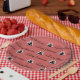 Ancien pays Noël arbres plaques de papier en rouge! Arrière - plan rouge. En noir avec ombrage blanc : arbres de Noël dans des pots avec des bougies à l'ancienne mode. Les mots "It's a Country Christmas" en noir et deux types de typographie.