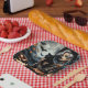 Plaques papier de fête d'Halloween. Prenez votre balai et survolez-vous ! sorcière tatouée gothique éffrayante avec un chat noir, des chauves-souris et des graphiques pleine lune.