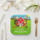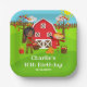Cette assiette mignonne et amusante présente une fille à la peau foncée avec un panier de pommes, un épouvantail et un corbeau. Dans l'arrière - plan est une grange rouge vif, une clôture marron piquetée, arbres, soleil, citrouilles et paniers de maïs et de pommes. Le texte combine des polices audacieuses et sans serif pour un look élégant et moderne. C'est parfait pour une fête d'automne sur le thème de l'anniversaire. Graphiques de MUJKA