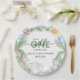 Plaques en papier baby shower illustrant l'aquarelle d'un singe, d'un perroquet, d'un rhinocéros et d'une girafe assis au milieu d'un arrière - plan de jungle verte. Vous pouvez modifier les styles, la taille et la couleur des polices en cliquant sur le lien personnaliser après la personnalisation.