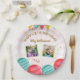 Plats de papier d'anniversaire amusants et festifs pour n'importe quel âge avec ballons rose, or et vert, serpentins et confettis, vos 2 photos et 2 lignes de texte personnalisé. Coloré, spirituel et classique - les assiettes parfaites pour les petits et les grands.