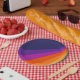 Assiettes En Carton Bandes rétro en diagonale violette et orange