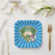 Cette jolie plaque d'anniversaire en papier design comporte un adorable chiot chien portant un casquette de baseball et prêt à jouer à la balle. L'arrière - plan est un terrain de baseball avec un décor de starburst bleu.