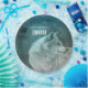 Plaques en papier avec une photo d'un magnifique loup gris et velouté. Dans l'arrière - plan est une forêt sombre avec des arbres. Vibe mystique magique.