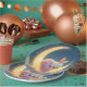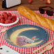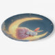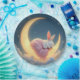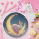 Un lapin blanc moelleux est enveloppé doucement dans une couverture rose, reposant paisiblement sur une lune de croissant brillante dans un ciel nocturne onirique. Peut être utilisé pour une douche bébé fille.