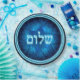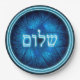 Un design élégant avec un texte hébreu bleu et blanc brillant, "Shalom" (ש ל ם - paix) superposé sur une image fractale bleue, à l'aspect gravé d'une Étoile de David.