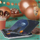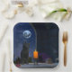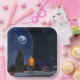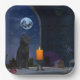 Un mignon chat noir est assis sur une table en regardant une bougie éclairée. Sur la table se trouvent également un livre, un gobelet, une bouteille, un coffre, un casquette et une boule de cristal avec un corbeau assis sur le dessus. Une pleine lune brille dans la fenêtre sur la scène.