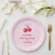 "Cherry first birthday" themed birthday paper plates with illustrated cherries tied with a pink preppy bow, and adorable handwritten fonts.