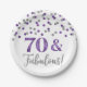 70 et fabuleuses assiettes de fête d'anniversaire avec confettis motif de parties scintillant argent et violet.