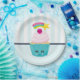Plaques de papier de fête avec un motif rayé bleu clair et blanc associé à un motif à pois bleu et rose. Sur le dessus se trouve un mignon cupcake bleu avec glaçage rose et un visage kawaii souriant. Une cerise sur le dessus a aussi un visage mignon. Une étoile filante vole en l'air