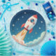 Cute red and white rocket blasting off in space with whimsical stars and clouds.