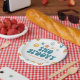 Deux assiettes de fête d'anniversaire de style rétro Super avec jaune, orange et bleu.