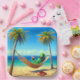 Grand cornichon vert se relaxant dans un hamac avec un cocktail tropical accroché entre deux palmiers tropicaux sur une plage aux tongs.