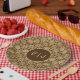 Belles et élégantes assiettes de fête en papier présentent des dahlias en or style pochoir motif floral sur arrière - plan marron foncé. Cercle central pour ajouter des couples monogramme/ initiales en police or sur arrière - plan brun