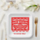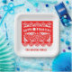 Ces assiettes de Noël sont ornées d'une bannière mexicaine en papier peint rouge avec la phrase Feliz Navidad sur le devant en blanc vif. En dessous de la bannière est un endroit pour ajouter un nom.