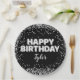 Plaques de papier de fête d'anniversaire en noir et blanc pour une fête amusante avec un look classique moderne avec parties scintillant et ballons d'aluminium sur plaques de papier personnalisées.