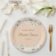 Élégante assiette en papier Fleur de Blanche pour fête de mariage avec délicat encadrement de fleurs printanières autour de vos détails de fête de mariage en élégante écriture dorée sur fond couleur pêche. Personnalisez avec vos détails d'événement spéciaux. Conçu par Thisisnotme©