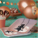 Silhouette fille sur une balançoire avec une pleine lune dans un ciel rose.