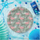 De beaux flamants roses pastel contemporains sur des feuilles de palmier vert sur des touches de pinceau bleu clair et jaune pâle motif.