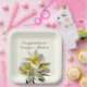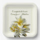 Plaques papier plumeria wedding shower ou fiançailles. Les plaques carrés ont une ligne de texte pour les noms et / ou félicitations. Les plaques jaune pâle ont une grande image de fleur. Frangipani blanc, ou plumeria, les fleurs ont des centres jaunes dorés combinés avec des bourgeons, dans ce design floral assez réaliste. Des lignes jaune clair encadrent le centre de la plaque. Les fleurs se déversent au fond. Cette conception fonctionne le mieux sur des plaques carrés qui sont en deux tailles. Utiliser pour un wedding shower décontracté ou une partie d'engagement.