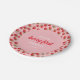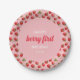 Plats de papier amusants "baies d'abord" fête d'anniversaire. Avec un motif de fraise élégant, rouge sur arrière - plan rose avec une police contrastée, avec une touche rétro.