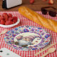Une Plaque De Papier Colorée Pour Son Anniversaire En Bleu, Rose Et Violet Avec Gnome Et Gâteau D'Anniversaire