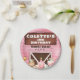 Cute ferme, ferme ou barnyard sur le thème de la plaque de papier d'anniversaire de fille avec un grand arrière - plan de grange rose, divers animaux de ferme mignons et une bannière en bois marron.