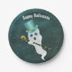 Cette plaque en papier a un fantôme blanc fantaisie flottant dans un ciel étoilé rempli d'étoiles portant un chapeau bleu dessus et tenant une canne noire et or surmontée d'un crâne doré. Customisez le texte Happy Halloween avec le modèle.