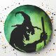 Plaque en papier avec une silhouette noire d'une sorcière ancienne qui agite un chaudron sur un arrière - plan noir et vert.