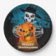 Un squelette éffrayant dans un casquette de houblon tient une lanterne de valet effrayant sur une nuit d'Halloween sombre sur ces plaques de papier de fête d'Halloween. CORRESPONDRE des articles dans notre magasin.