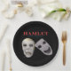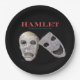 Pour des cuirs épais de théâtre. Le titre d'expositions de Hamlet de Shakespeare en rouge lumineux et sont dessous des masques de comédie. Derrière un masque grimacent des dents et un oeil bleu simple.