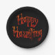 Texte "Happy Haunting" en lettres spectrales orange, avec quelques yeux fantomatiques, un dessin humoristique pour une Halloween obsédante