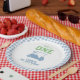 First birthday golf theme "Hole in One " with gold cart and light blue checkered plaid pattern.
