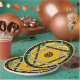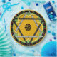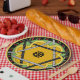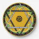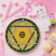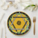 Un design original gai avec un mandala central qui entrelace une fleur jaune daffodil avec un point de polka Star de David, le tout posé sur un arrière - plan vert printemps, une bordure de cerises rouges et feuilles verts contre le noir et une dernière bordure de jaune stalle. Parfait pour les fêtes en plein air, la table pour enfants pour les réunions familiales ou les assiettes de déjeuner.
