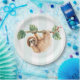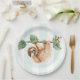 Plaques en papier avec une adorable paresse accrochée à l'envers d'une branche d'arbre. La branche d'arbre est décorée de feuilles tropicaux et de baies. Placé sur un arrière - plan rayé vert clair et blanc.