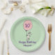 Plaques en papier d'anniversaire avec un lapin lunatique tenant un gros ballon rose flottant dans l'air. Placez-vous sur un arrière - plan vert clair.