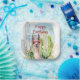 Llama aquarelle avec lunettes en forme de coeur, et un casquette d'anniversaire avec un paysage désertique dans l'arrière - plan.
