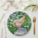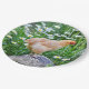 Ces assiettes d'anniversaire de poulet présentent un magnifique poulet Buff Orpington posé sur un muchroom en bois entouré d'un jardin de chaises.