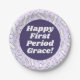 Un autre joli ensemble de plaques personnalisables de JessicaAmber - renseignez-vous sur les commandes personnalisées! Ces assiettes sont parfaites pour des collations à la fête de la première période de votre enfant ou de votre fille adolescente. Comprend un adorable motif de produits menstruels comme des serviettes hygiéniques, des draps, des gobelets menstruels et des tampons. Dessiné dans un style kawaii de dessins animés avec de petits visages heureux, dans un coloris pastel violet et blanc. Le devant a le slogan 'Happy First Period Grace', que vous pouvez changer pour ajouter le nom de votre fille. 🩸 Créé le 19 août 2023. Pour plus de fournitures de première période, visitez mon magasin Zazzle.com/JessicaAmberArtist ⭐ Pour les commandes sur mesure, envoyez-moi un courriel à jessicaamberartist+zazzle(at)gmail.com