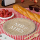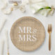 Mr & Mrs Rustic Burlap Mariage Des plaques en papier simples sont disponibles en quelques tailles pour une réception de mariage rustique en plein air.