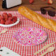 Motif de mandala à douze points dans les tons rose fuchsia, pêche et corail, bordée et accentuée de blanc
