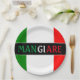 Cette plaque de fête personnalisée comporte l'expression "mangiare" imprimée sur le centre. Mangiare est la traduction italienne pour "manger" et il est imprimé aux couleurs du drapeau italien. Les trois premières lettres sont vertes, les deux secondes sont blanches, et les trois dernières sont rouges. Il est imprimé sur le drapeau italien.