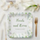 Cette assiette mariage est ornée de feuilles d'eucalyptus, dans la verdure botanique. C'est parfait pour un mariage d'été de printemps.
