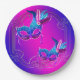 Plaques de papier de fête mascarade rose et violet avec de beaux masques en plumes turquoises bleues et violettes sur un bel arrière - plan violet et rose. Vous pouvez ajouter du texte pour personnaliser ces magnifiques plaques de papier de soirée violet et bleu turquoise.