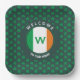 Plaques de papier carré SHAMROCK monogramme modernes, conçues avec un motif shamrock tout-en-un contre un arrière - plan vert foncé. Le drapeau irlandais est placé dans un cercle. Il y a du texte courbe PERSONNALISABLE en haut et en bas du cercle, plus un MONOGRAM qui est également personnalisable. Ce texte peut être remplacé par un message de bienvenue et/ou personnalisé avec votre nom, ou le nom de votre établissement. Idéal pour vos invités ou clients le jour de la Saint Patrick.