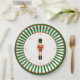 Christmas Nutcracker paper plate in green, white and red tones with green and white stripes and golden stars