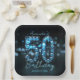 Celebrate the big 5-0 in luxurious style with these "Teal Blue Diamond" 50th Birthday paper plates. This design features a stunning, high-resolution digital rendering of the number "50" embedded with faux turquoise, sapphire, and teal gemstones, set inside a sleek silver chrome frame. The background sets a sophisticated night-time mood with a deep black gradient and glowing "bokeh" light effects in soft blues and silvers. Finished with elegant, handwritten script typography in metallic silver and teal, this tableware is perfect for an elegant evening party, a gala-themed birthday, or a glamorous "Denim and Diamonds" event. Easily customize this template by adding the birthday honoree's name and the event date to create a truly unique keepsake for your milestone celebration.